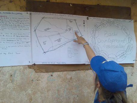 Esther pointing at some maps hanging at the home of the district chief, whom we visited.