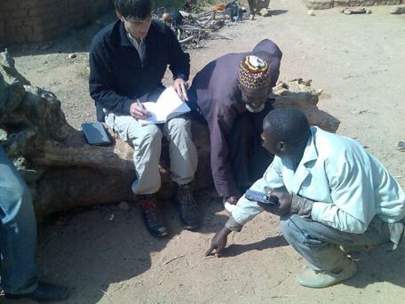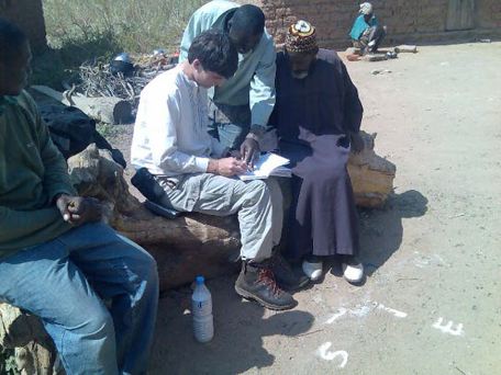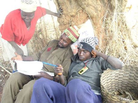 Ab, ElHadj Masseia and John talking about routes and drawing a map on the ground.