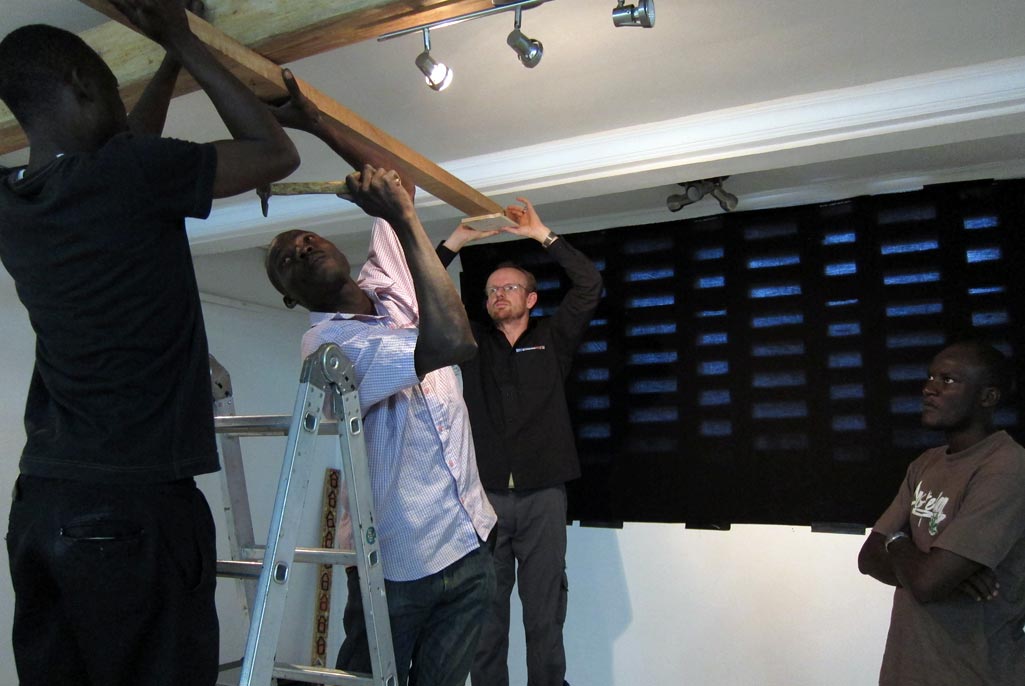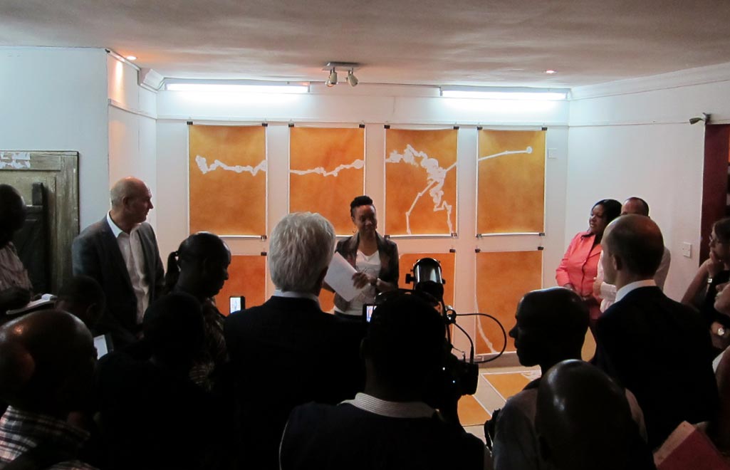 Opening speech by Omotayo Adeola Esther hands over two prints to Bob Steetkamp (WAMCO Nigeria) and Hans Leenders (Dutch embassy) for the Dutch Foreign Ministry and WAMCO company art collections First visitors Last check before opening