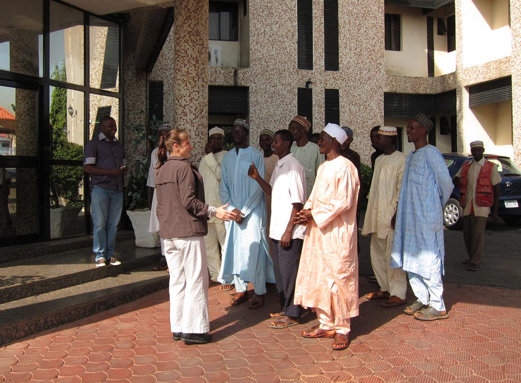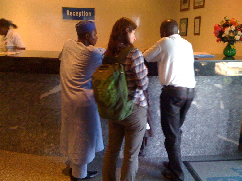Suleiman and James help us check in at the hotel. Tomorrow we go to the village to show the project results to Mr. Idiris, Binta, Amina, Samaila and their family.